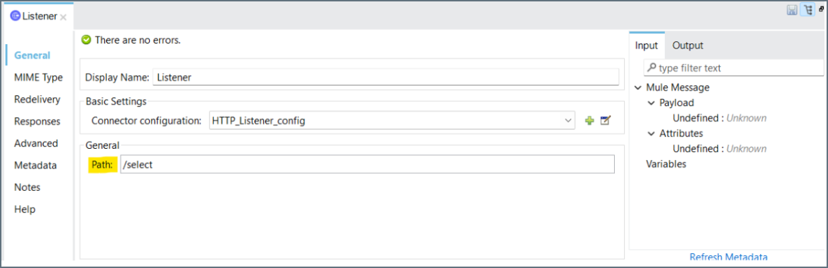 Click the + sign to the right of Connector configuration. The HTTP Listener config dialog appears.