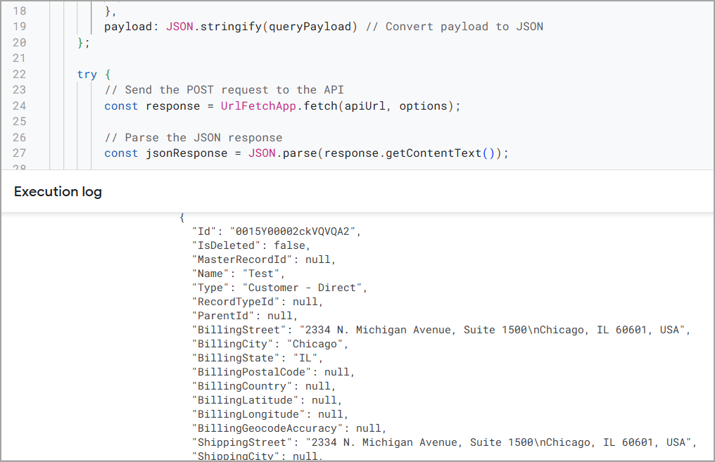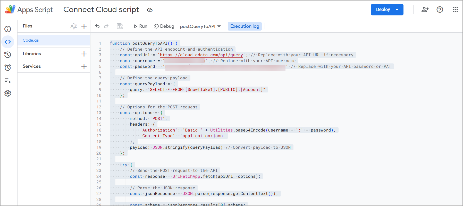 Copy and paste the script below into the Apps Script project. This script connects your data source to the Query API and outputs the results to the Apps Script console. Change the following in the script: