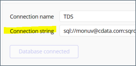 it is also possible to add a database connection name at the end of the connection string like sql://[Username]:[Password]@tds.cdata.com:14333/[ConnectionName].